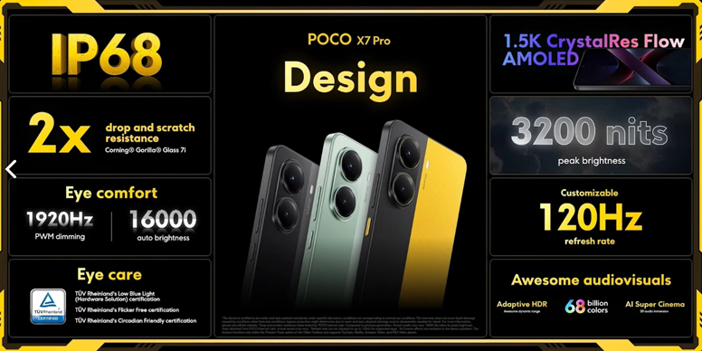 Poco X7 Pro предлагает современный и функциональный плоский дизайн, в отличие от изогнутой модели X7, что придаёт смартфону более эргономичный и надёжный захват. Его передняя панель изготовлена из прочного стекла Gorilla Glass 7i, а рамка и задняя панель выполнены из матового пластика. На некоторых рынках предусмотрена версия с классом защиты IP69, что означает защиту от струй воды под давлением. POCO X7 Pro получил 3 различные расцветки корпуса - черный, зеленый и черно-желтый