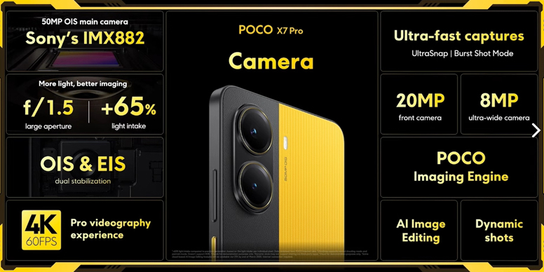 По сравнению с предшественником POCO X6 Pro, в новой модели была заметно уменьшена камера, что сделало корпус POCO X7 Pro компактнее. На передней панели находится небольшой вырез для 20-мегапиксельной фронтальной камеры. Стереозвук обеспечивают два динамика: один на верхней части устройства и второй, размещённый внизу рядом с портом USB-C. Дополнительно, смартфон оснащён двумя микрофонами — ещё один расположен рядом с ИК-портом на верхней грани устройства. Оптический сканер отпечатков пальцев, встроенный под экраном, работает быстро и точно.