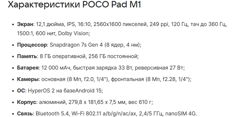 Poco Pad M1 — по сути, близнец Redmi Pad 2 Pro. Аппаратная часть и поддерживаемые аксессуары полностью совпадают, различия сводятся к позиционированию и тому, что устройство предлагается в единственной версии по объёму памяти и в двух цветовых исполнениях.